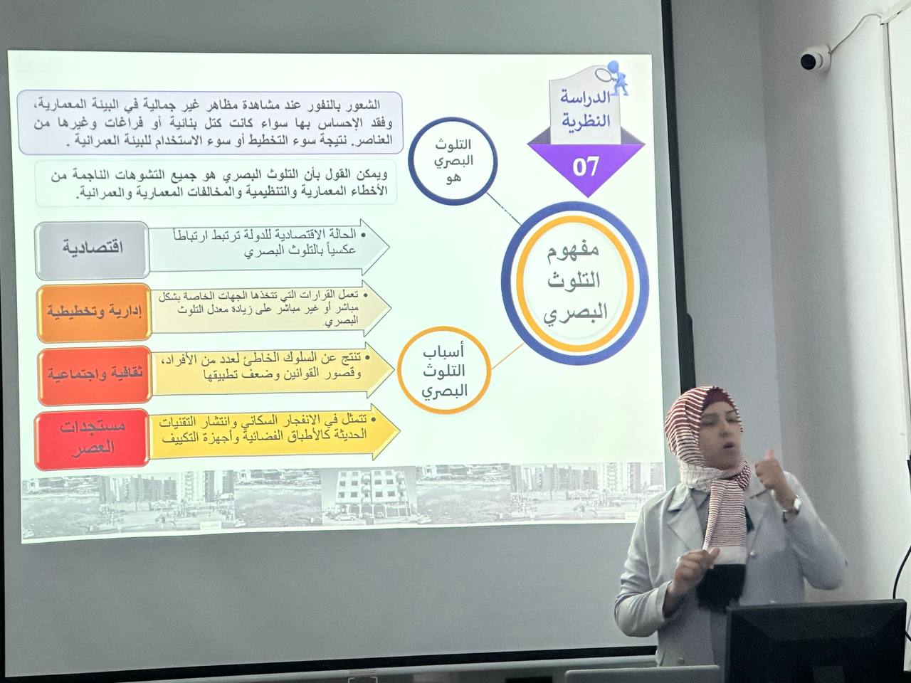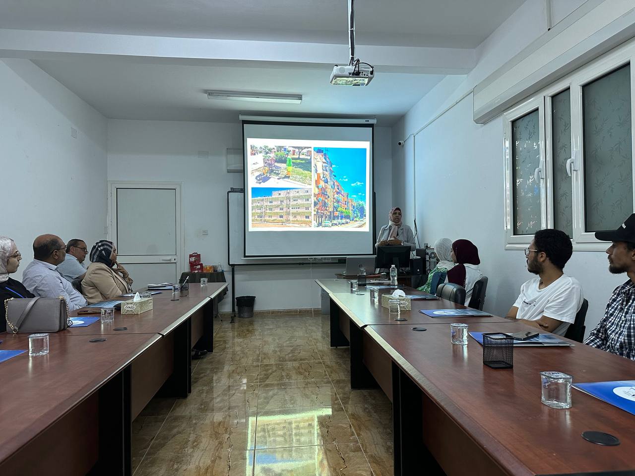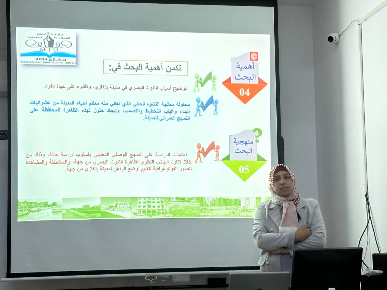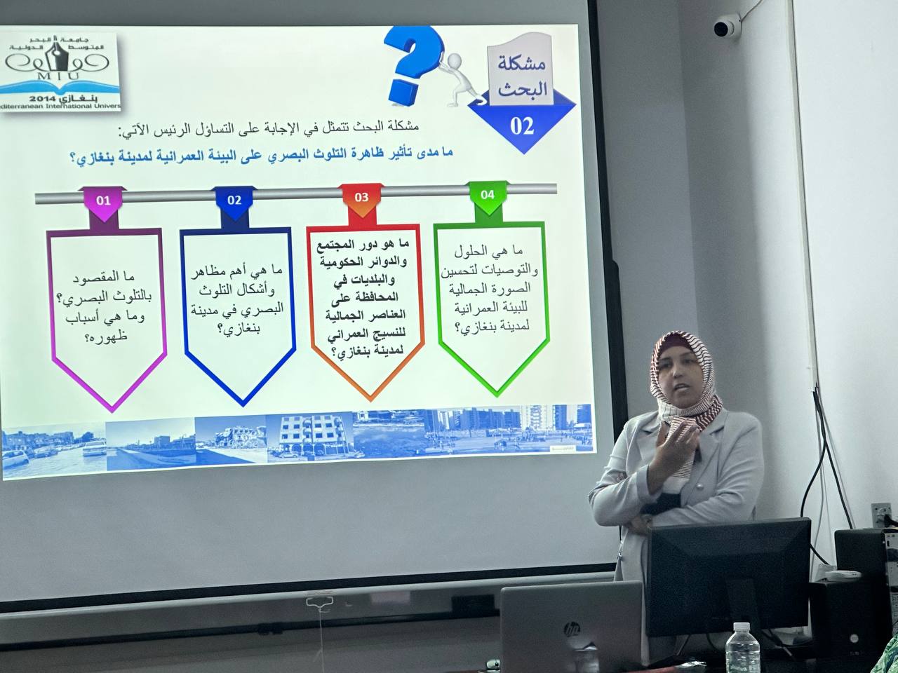 - وحضرهذه المحاضرة عدد من أعضاء هيئة التدريس بالجامعة ومجموعة من طلبة الهندسة المعمارية وطلبة هندسة التصميم الداخلي. وقد تخلل المحاضرة تفاعل من الحضور واهتمام بكيفية معالجة هذه المشكلة في مدينة بنغازي.