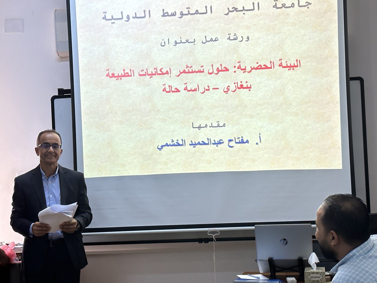 في إطار الخدمة المجتمعية ، نظمت كلية الهندسة بجامعة البحر المتوسط الدولية صباح يوم الخميس 24/8/2023 ورشة عمل بعنوان ” البيئة الحضرية : حلول تستثمر أمكانيات الطبيعة (بنغازي – دراسة حالة) “. أعدها وقدمها الأستاذ مفتاح عبد الحميد الخشمي . حضر ورشة العمل هذه عددا من أعضاء هيئة التدريس بالجامعة ومجموعة من طلبة كلية الهندسة وكذلك عدداً من المهتمين بمجال البيئة . وقد تخلل هذه الورشة تفاعل من الحضور واهتمام بكيفية معالجة هذه المشكلة في مدينة بنغازي.