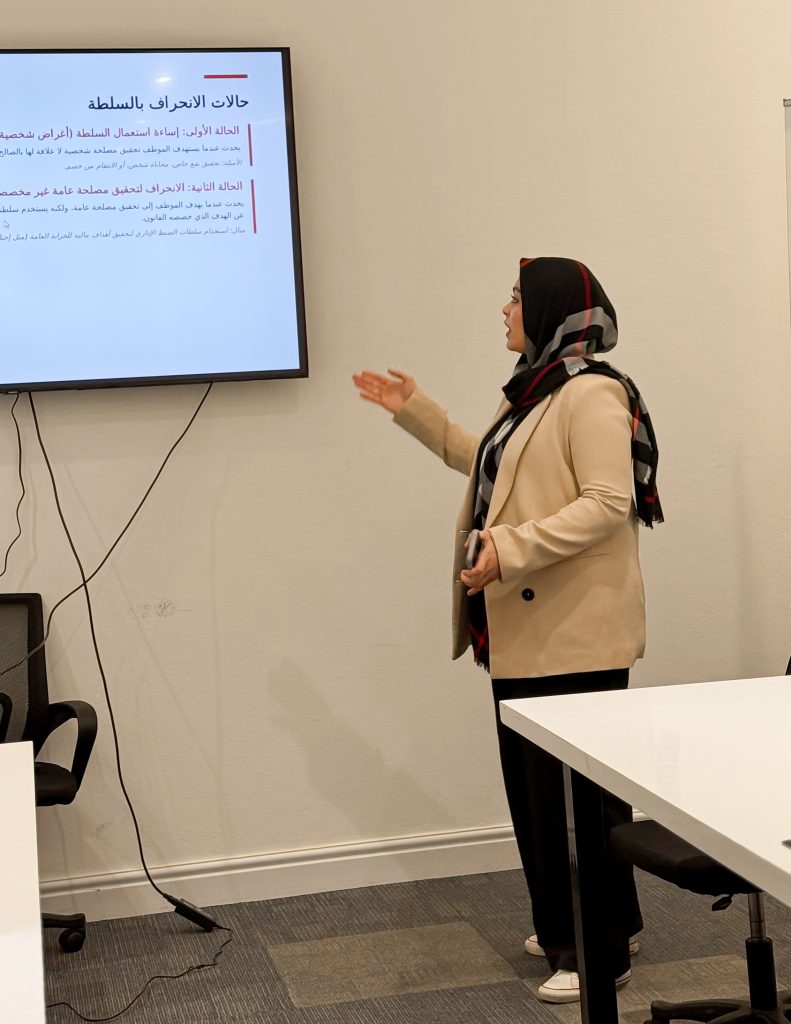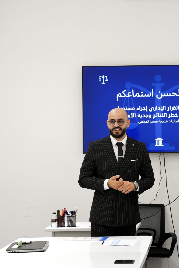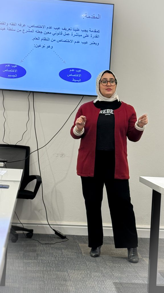 في إطار ربط الجانب النظري بالجانب العملي، نظمت كلية القانون يوم الاثنين الموافق 2025/12/29 جلسة علمية ضمن مادة القضاء الإداري، أشرف عليها الأستاذ علي السعيطي، حيث قدّم طلبة الكلية عروضًا علمية متميزة حول موضوعات متخصصة في هذا الفرع الحيوي من القانون.